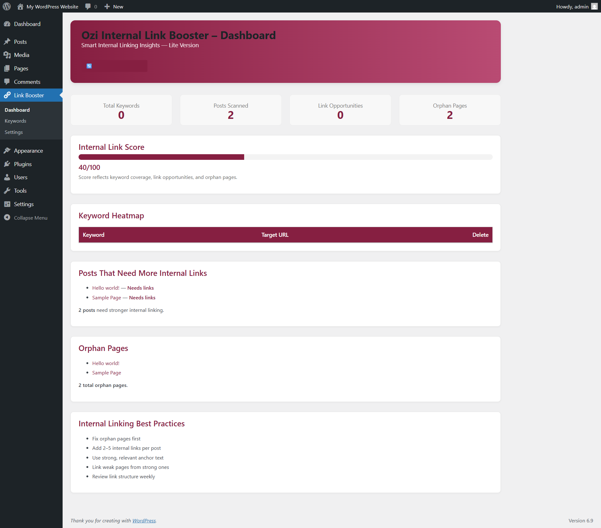 Instead of blindly inserting links, the plugin gives you controlled keyword-to-page mapping, SEO-safe limits, and visibility into pages that are missing internal links.
